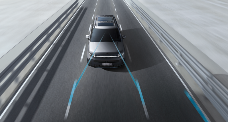 Kamera depan melacak penanda garis jalur dan membantu pengemudi untuk tetap menjaga kendaraan agar tetap aman di tengah jalur.